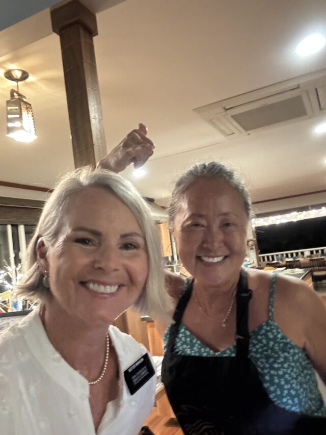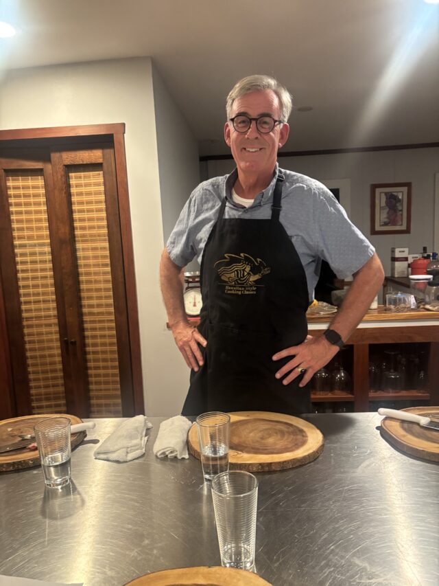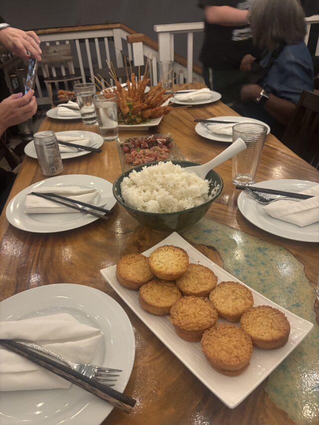 For Christmas our children gifted us a fun Hawaiian Cooking Class. We attended with 8 other individuals at Linda’s home located near Diamond Head overlooking the ocean. Linda is an adventurous entrepreneur who has been involved with catering, owning and operating food establishments for the last 40 years. She was so much fun and shared her extensive knowledge of the history of Hawaiian food. We made Coconut Kahuku Shrimp, three types of poke, Masubi and Mochi rice cakes–all very traditional Hawaiian fare. We loved it and may go back for another class.